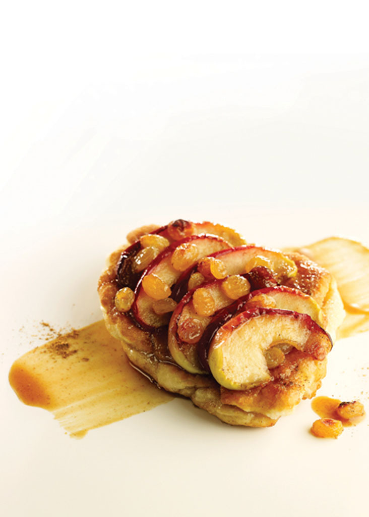 - Dans une grande poêle, faites dorer les pommes dans le beurre moussant, saupoudrez de sucre brun et laissez caraméliser. Ajoutez les raisins blonds et la crème, puis faites réduire 2 min. Réservez.