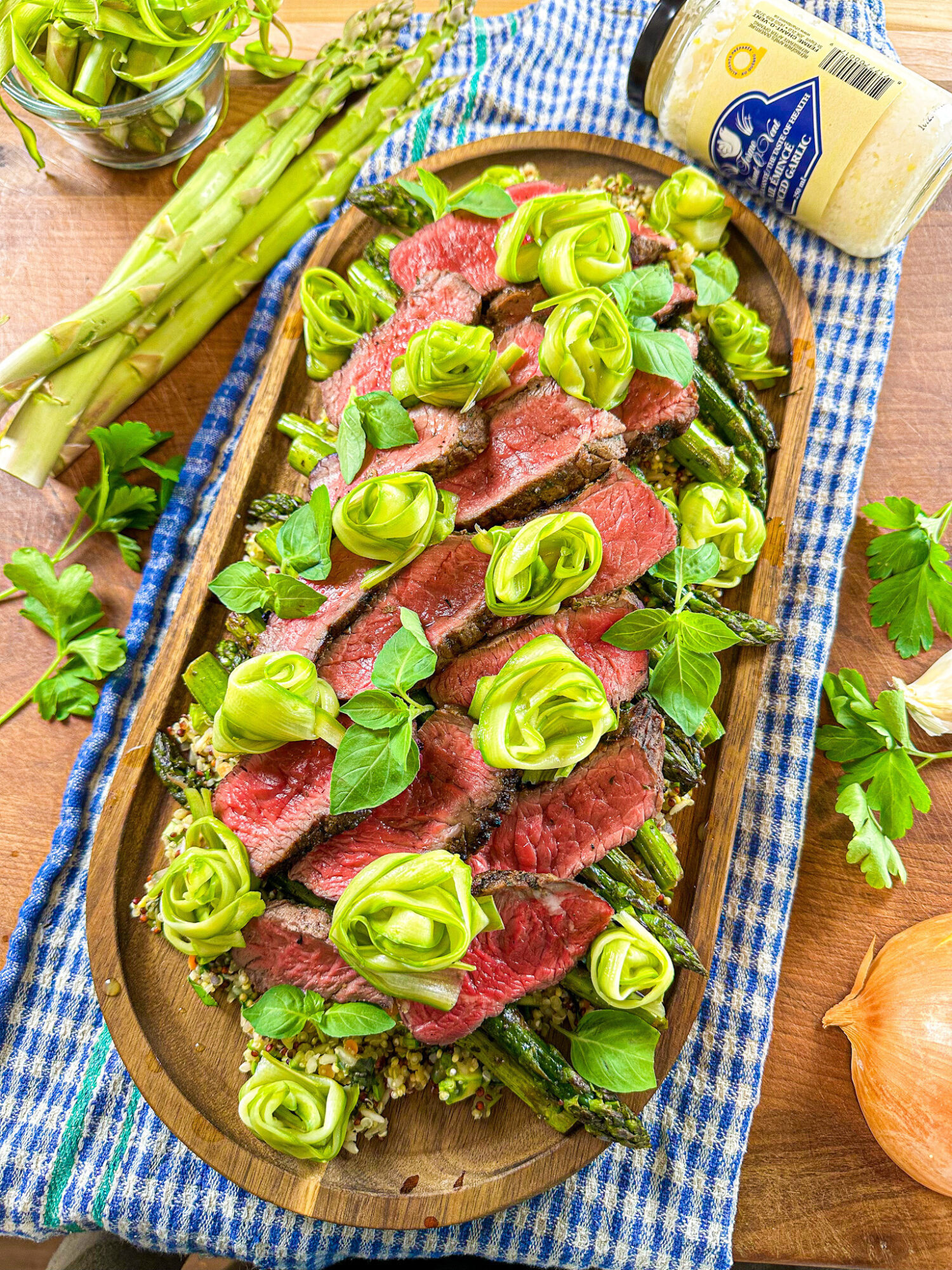 - Servir les tranches de bœuf avec le mélange 5 grains, les asperges grillées et les roses d’asperges au citron.