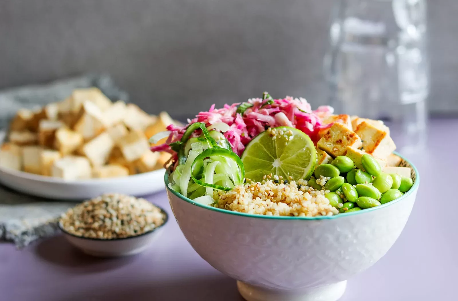 - Dans les bols de service, répartir le quinoa, le concombre, les fèves édamames, le tofu et la salade de céleri-rave et betteraves.