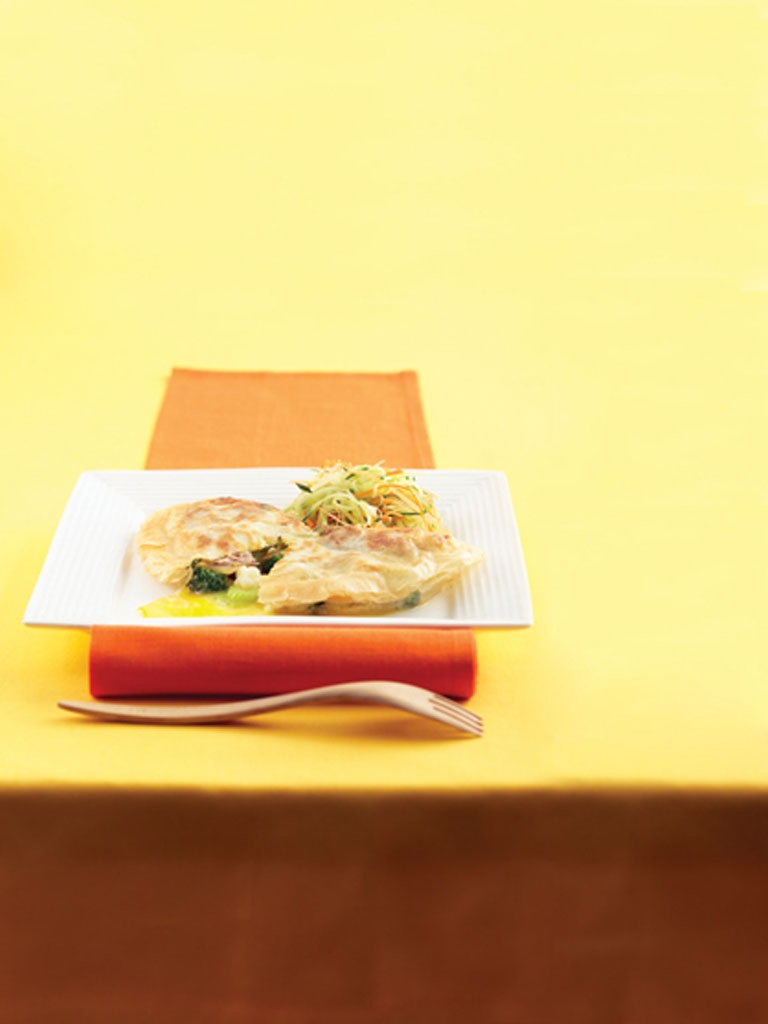 - Cuire environ 2 minutes de chaque côté puis déposer sur un plaque à pâtisserie. Répéter les opérations avec les autres feuilles pour obtenir quatre chaussons. Déposer les bricks au four et réchauffer pendant 5 minutes. Servir aussitôt. Si désiré, accompagner d’une julienne de concombres et de carottes.