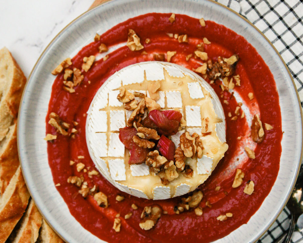 - Dans une belle assiette de service, déposer la purée, ajouter le fromage brie cuit par-dessus celle-ci et garnir avec les morceaux de rhubarbe. Finalement, ajouter les noix!
