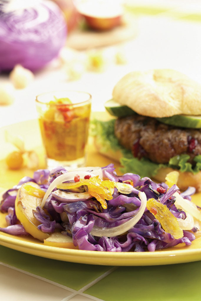 - Servir dans un pain Ciabata et garnir de laitue, tranches de tomate et chutney aux cerises de terre au cari.