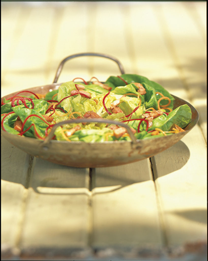 Ouvrir la laitue Boston pour former une belle grosse fleur. Déposer carotte et betterave en julienne parmi les pétales de la Boston. Arroser de vinaigrette et servir immédiatement.