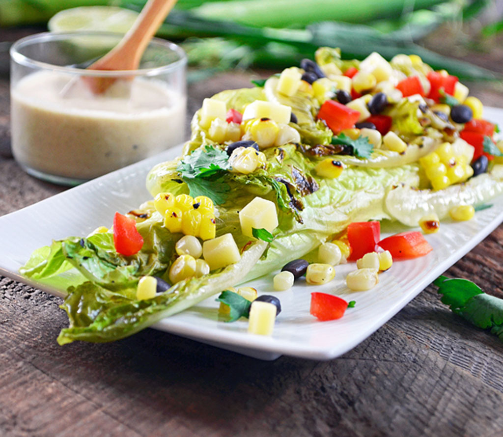 Placer la face coupée des cœurs de romaine sur la grille du barbecue environ 1 à 2 minutes ou jusqu’à ce qu’ils soient bien marqués. - Déposer un demi-cœur de salade grillé dans chaque assiette, répartir les garnitures dessus, et arroser de vinaigrette au goût. Servir en entrée ou accompagnement.