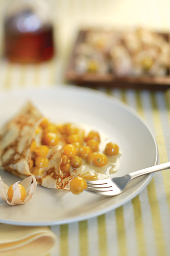 Enlever la membrane des cerises de terre. À l’eau courante, bien laver le fruit et le tour de la tige pour ôter la matière résineuse. Dans une autre poêle, mettre le beurre à feu moyen, ajouter les cerises de terre et laisser cuire 1 min. Verser le sirop d’érable, poivrer légèrement, puis ajouter la crème anglaise.