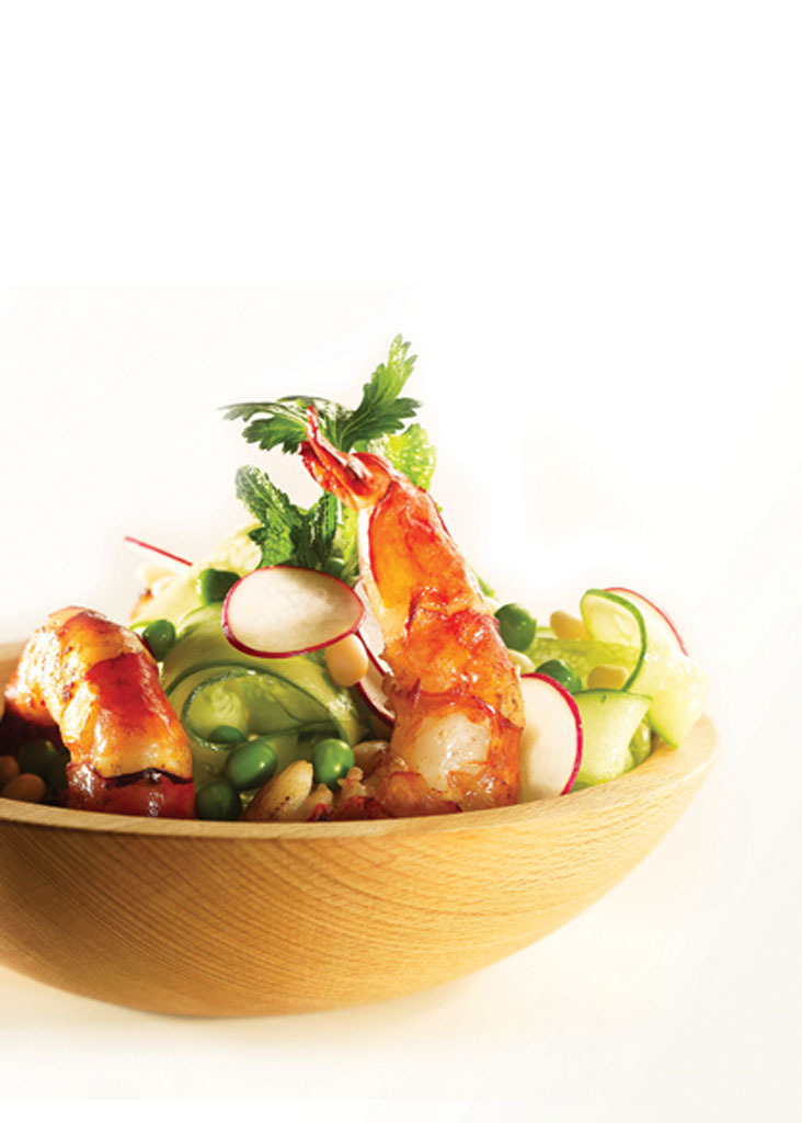 - Dans un grand saladier, assemblez tous les autres ingrédients et 5 min avant de servir, ajoutez-y la vinaigrette et les crevettes. Salez et poivrez.