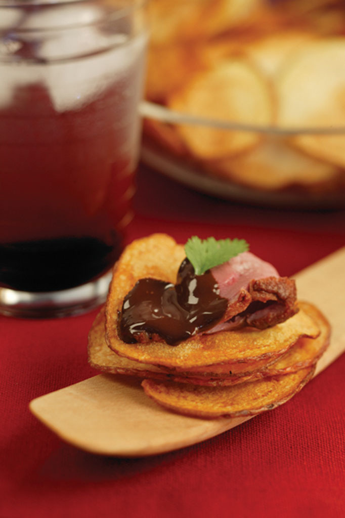 - Dans un bain-marie, faire fondre le chocolat. Couper le magret en fines tranches, puis tremper la moitié de chacune des tranches dans le chocolat fondu. Empiler quelques croustilles, les couronner d’une tranche de magret, puis décorer de l’une de ses fines herbes préférées.