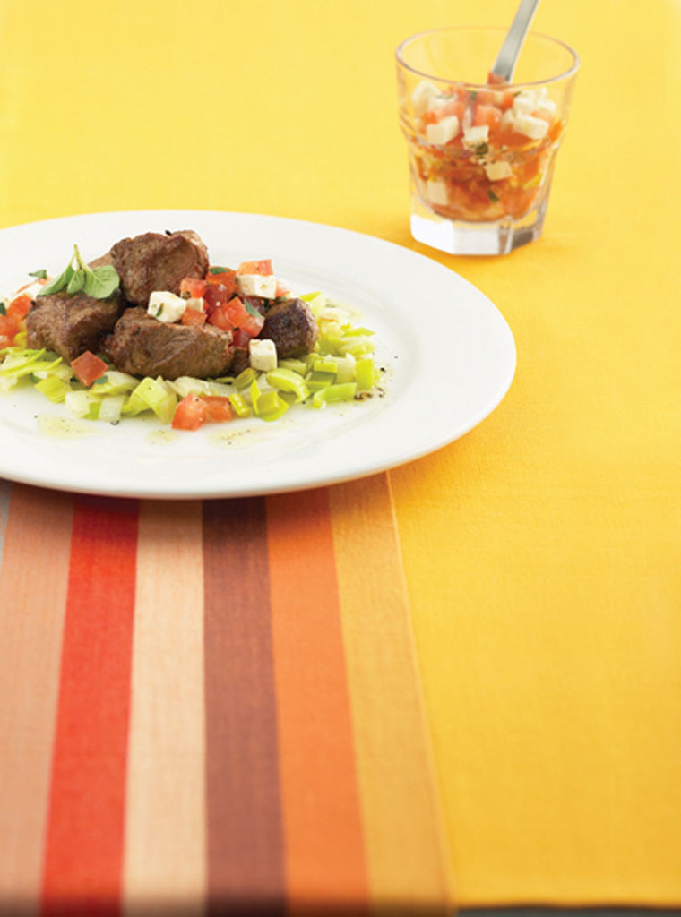 Cubes d’agneau à la tombée de poireaux, concassé de tomates et de feta