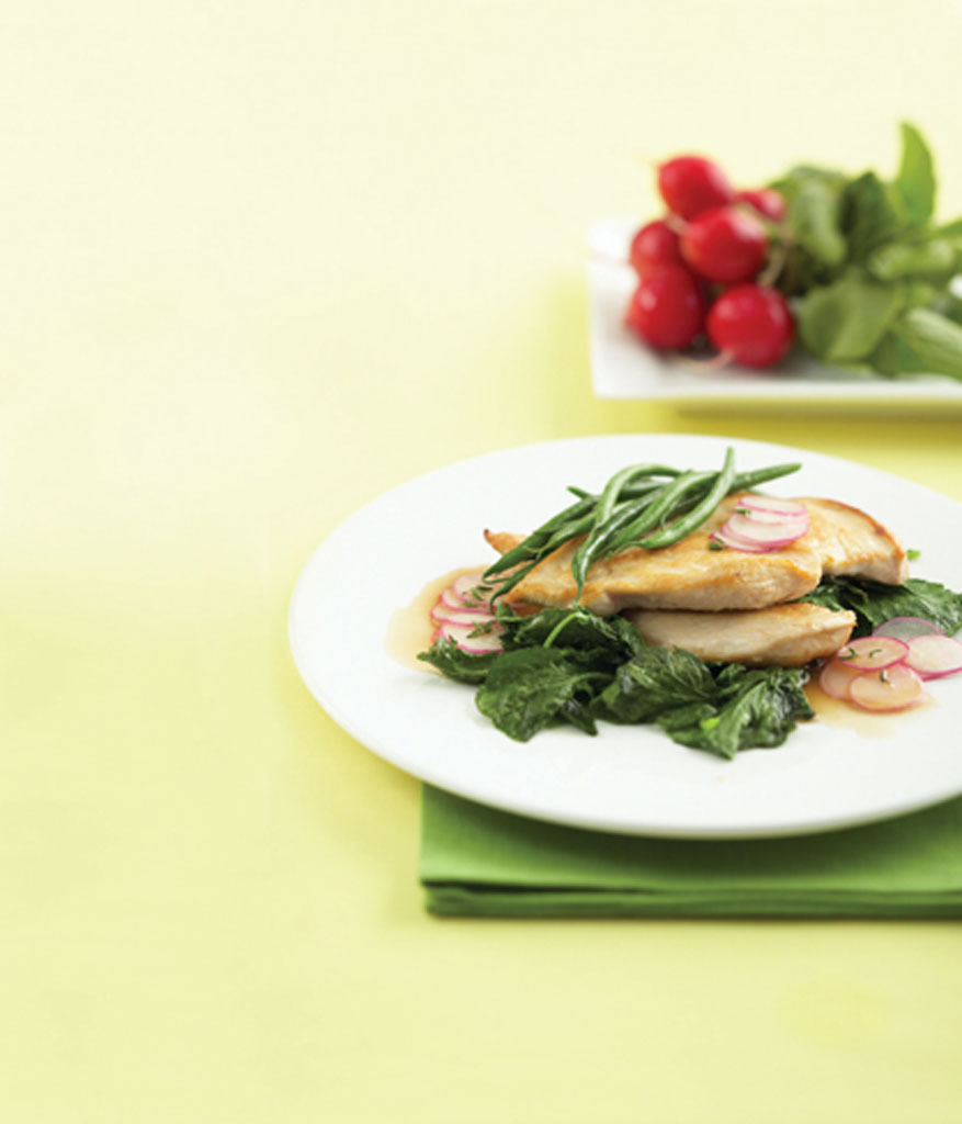 radis environ 1 minute. Déglacer au vin blanc, ajouter le miel et réduire de moitié. Ajouter le bouillon et la crème et réduire de 2 à 3 minutes ou jusqu’à l’obtention d’une sauce onctueuse. - Servir les escalopes et les radis au miel et si désiré, accompagner de feuilles de radis ou d’épinards tombés au beurre.