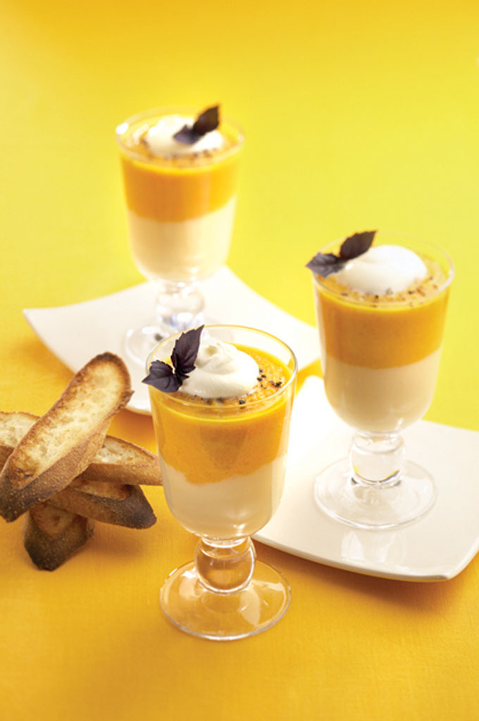 - Dans des coupes de verre résistant à la chaleur, verser une première louche de potage aux navets, puis verser très délicatement une seconde louche de potage aux carottes. Ponctuer d’une cuillère de crème fouettée et de quelques feuilles de basilic pourpre.