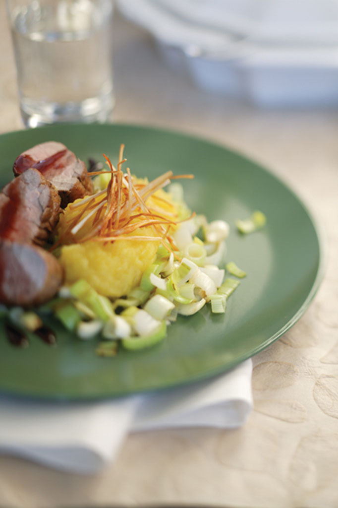 - Parer les filets de porc, puis saler et poivrer. Mettre 25 g (env. 2 c. à soupe) de beurre dans une poêle et y faire dorer les filets de chaque côté. Déglacer la poêle au vin rouge et terminer la cuisson au four, de 7 à 8 min ou jusqu’à ce que la viande soit légèrement rosée. Entre-temps, laver le poireau et couper le blanc en julienne. Faire chauffer l’huile et frire à grande friture jusqu’à ce que le poireau soit bien doré. Déposer le poireau sur du papier essuie-tout et réserver. Émincer le reste du poireau et le faire sauter légèrement dans 30 ml de beurre; assurez-vous que le poireau conserve sa couleur vert vif. Assaisonnez de sel et du poivre.