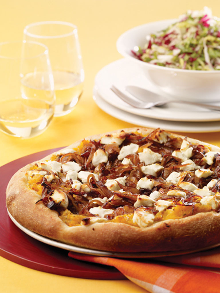 - Sur une surface légèrement enfarinée, abaisser la pâte en un disque de 30 cm (12 pouces) de diamètre. Déposer la pâte sur une plaque à biscuit légèrement huilée. Badigeonner la surface d’huile, recouvrir d’une pellicule de plastique et laisser gonfler 15 minutes. Étendre la purée de courge sur la surface de la pâte en laissant une bordure de 1 cm (1/2 pouce). Recouvrir avec les oignons caramélisés et garnir avec le fromage de chèvre et le parmesan.