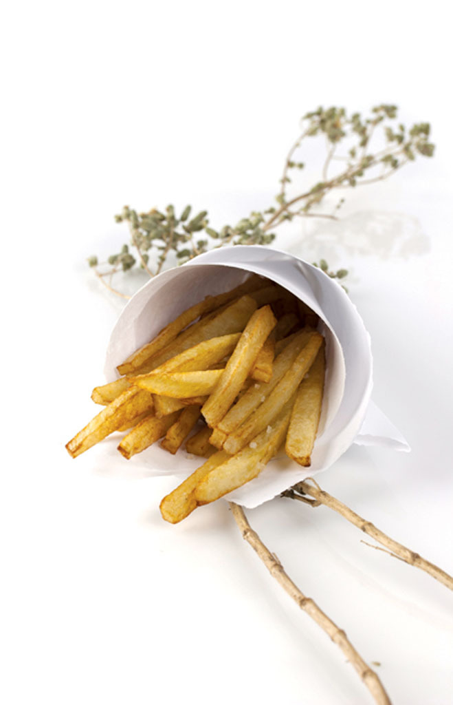 Faites chauffer l’huile à feu vif dans un grand wok. Pour savoir si l’huile est chaude, déposez-y un bâtonnet. S’il remonte à la surface, vous pouvez commencer la friture. Déposez le tiers des pommes de terre dans l’huile et attendez qu’elles deviennent bien dorées. Égouttez, déposez sur un papier essuie-tout et salez. Répétez ensuite deux fois l’opération avec le restant des bâtonnets. Présentez les frites dans un petit cône de papier blanc. Servez avec une mayonnaisse maison, de la moutarde de Dijon ou du miel.