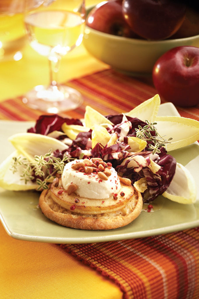 - Sur la plaque à cuisson, déposer sur chaque demi muffin une tranche de pomme, puis un fromage par-dessus. Faire cuire 10 min au four toujours préchauffé 180 ºC (350 ºF). Sortir du four et parsemer de pignons et de grains de poivre.