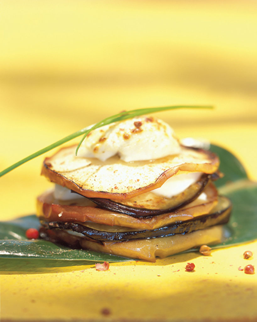 - Préchauffer le four à broil. Couper les pommes et l’aubergine en tranches minces. Faire chauffer l’huile et le beurre dans une poêle, puis y faire sauter les pommes et les aubergines. Saler et poivrer.