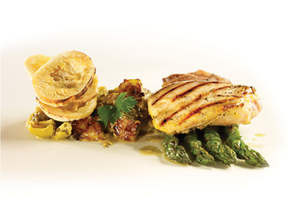 Hauts de cuisse marinés, caponata à l’aubergine et asperges rôties