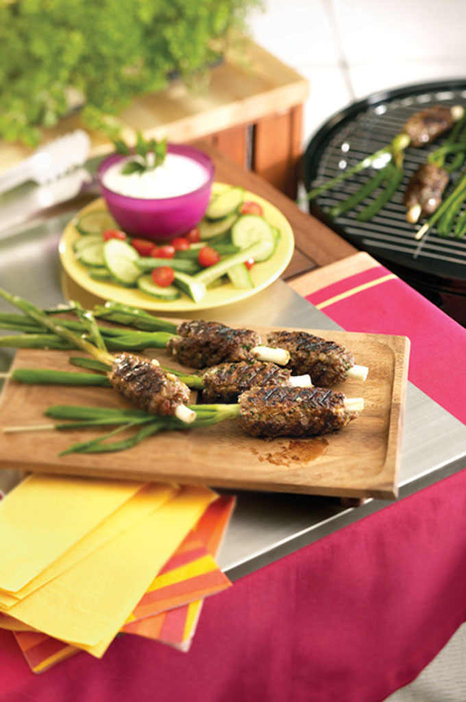 - Dans un bol, mélanger l’agneau haché, l’ail, le persil, l’oignon et la chapelure. Saler et poivrer, au goût. Diviser ce mélange en huit portions et façonner les keftas autour des oignons verts. Réfrigérer 30 minutes, puis badigeonner d’huile d’olive. Griller sur le barbecue à intensité moyenne élevée pendant environ 10 minutes, en les retournant à plusieurs reprises.