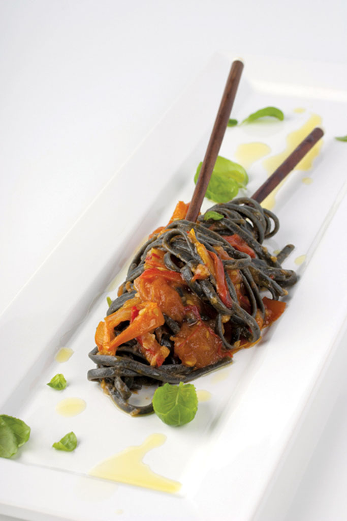 Linguine à l’encre de seiche, sauce aux poivrons de couleurs