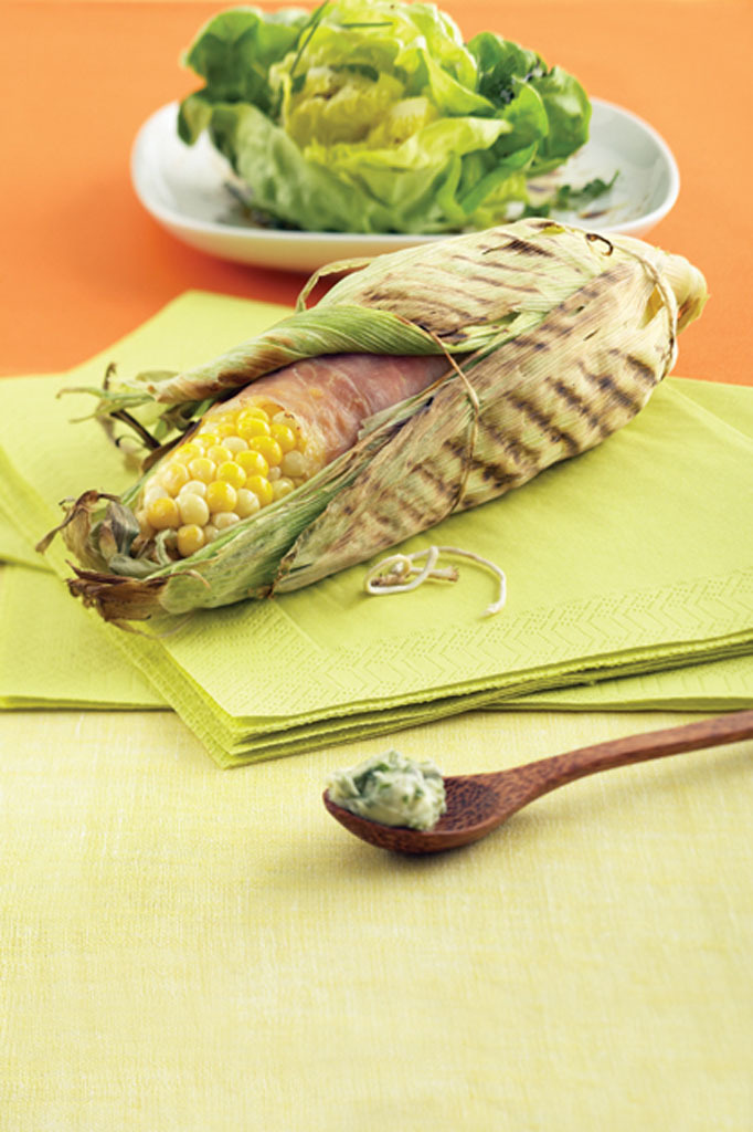 - Pendant ce temps, préparer le beurre aux herbes. Mélanger le beurre, l’ail, le basilic, le persil et le romarin. Assécher les épis de maïs. Enrouler une tranche de prosciutto autour de l’épi. Refermer les feuilles puis attacher avec de la ficelle de boucher.