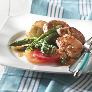 - Déglacer le poêlon avec la sauce aux échalotes. Rectifier l’assaisonnement. Réchauffer rapidement les pommes de terre et les asperges dans le poêlon.