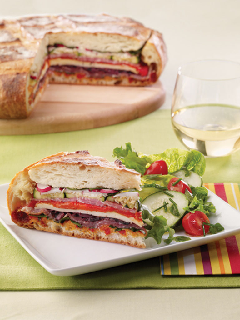 - Étaler en couches superposées le jambon blanc ou le prosciutto, le fromage provolone, les poivrons rouges rôtis, le salami génois, les courgettes, le parmesan et terminer avec les radis et le basilic. Recouvrir avec la calotte de la miche et presser fermement.