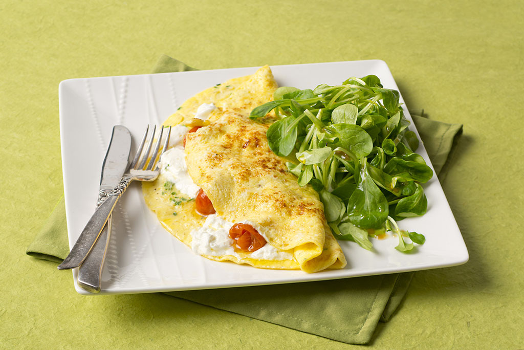 Omelette au chèvre, aux tomates confites et à la mâche