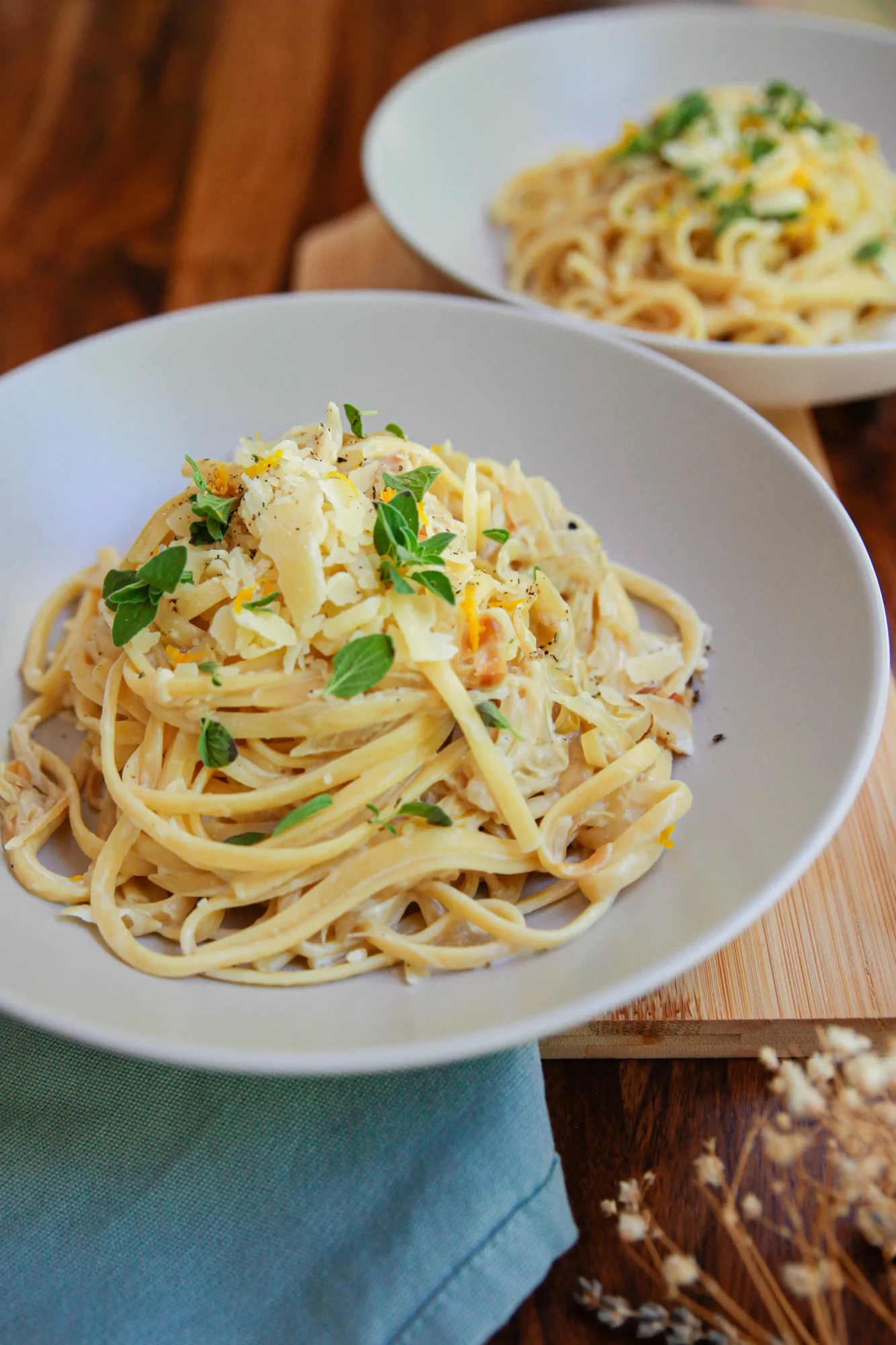 - Ajouter les pâtes cuites à la sauce ainsi que l’origan, le zeste et jus de citron.