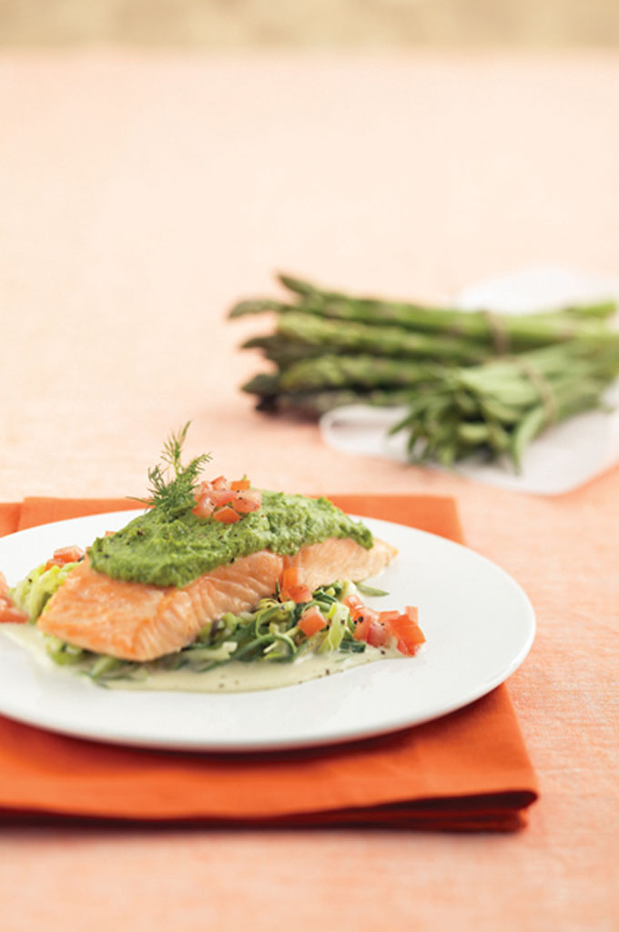 Pavé de saumon à la purée d’asperges et de haricots verts