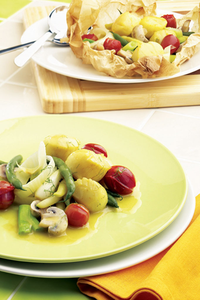 - Pour servir, transférer le contenu de la papillote sur une assiette chaude. Décorer d’aneth frais.