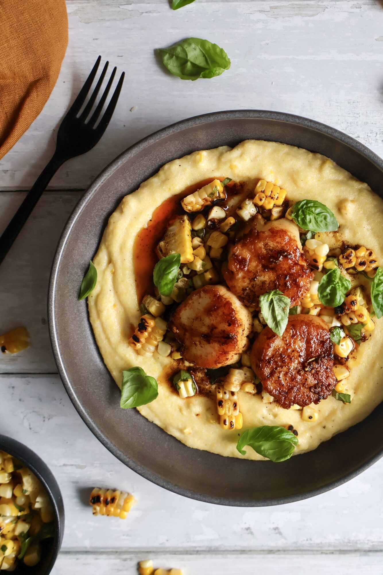 Pétoncles sur polenta crémeuse au maïs sucré grillé