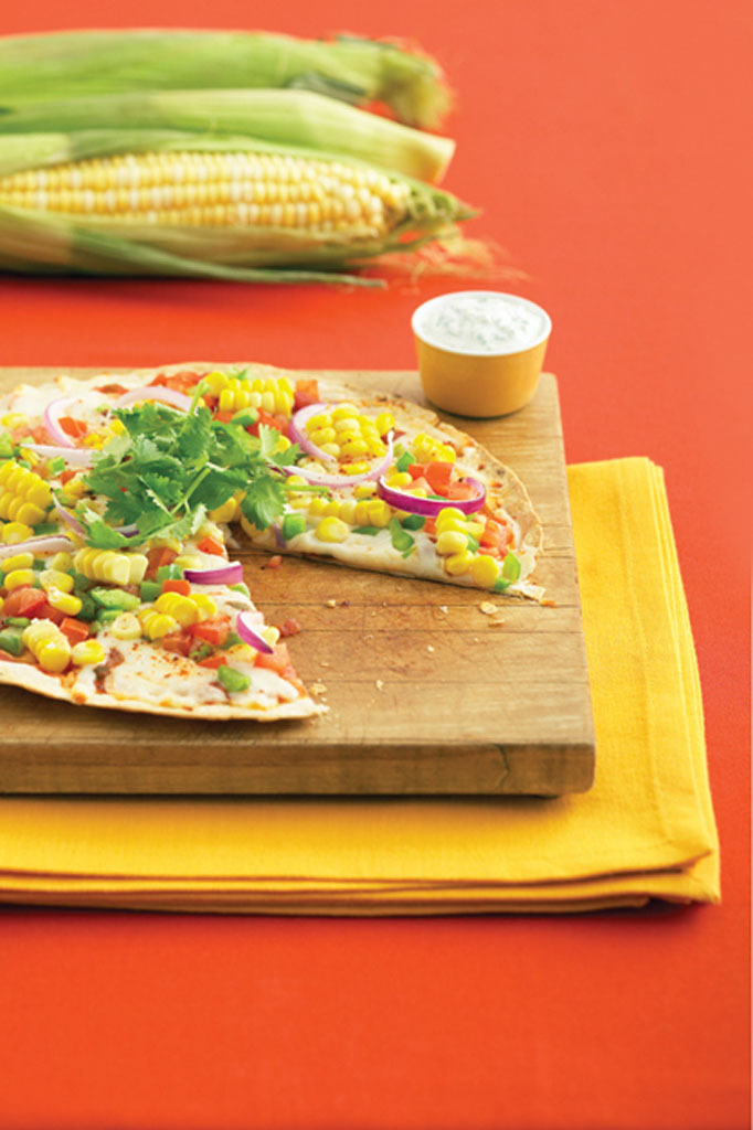 - Préchauffer le four à 200 °C (400 °F). Déposer les tortillas sur des plaques à pizza (utiliser idéalement des plaques perforées afin d’obtenir une pâte fine et bien croustillante.) Répartir la salsa et le fromage sur les tortillas puis garnir de tomates, de poivrons, d’oignons et de maïs.
