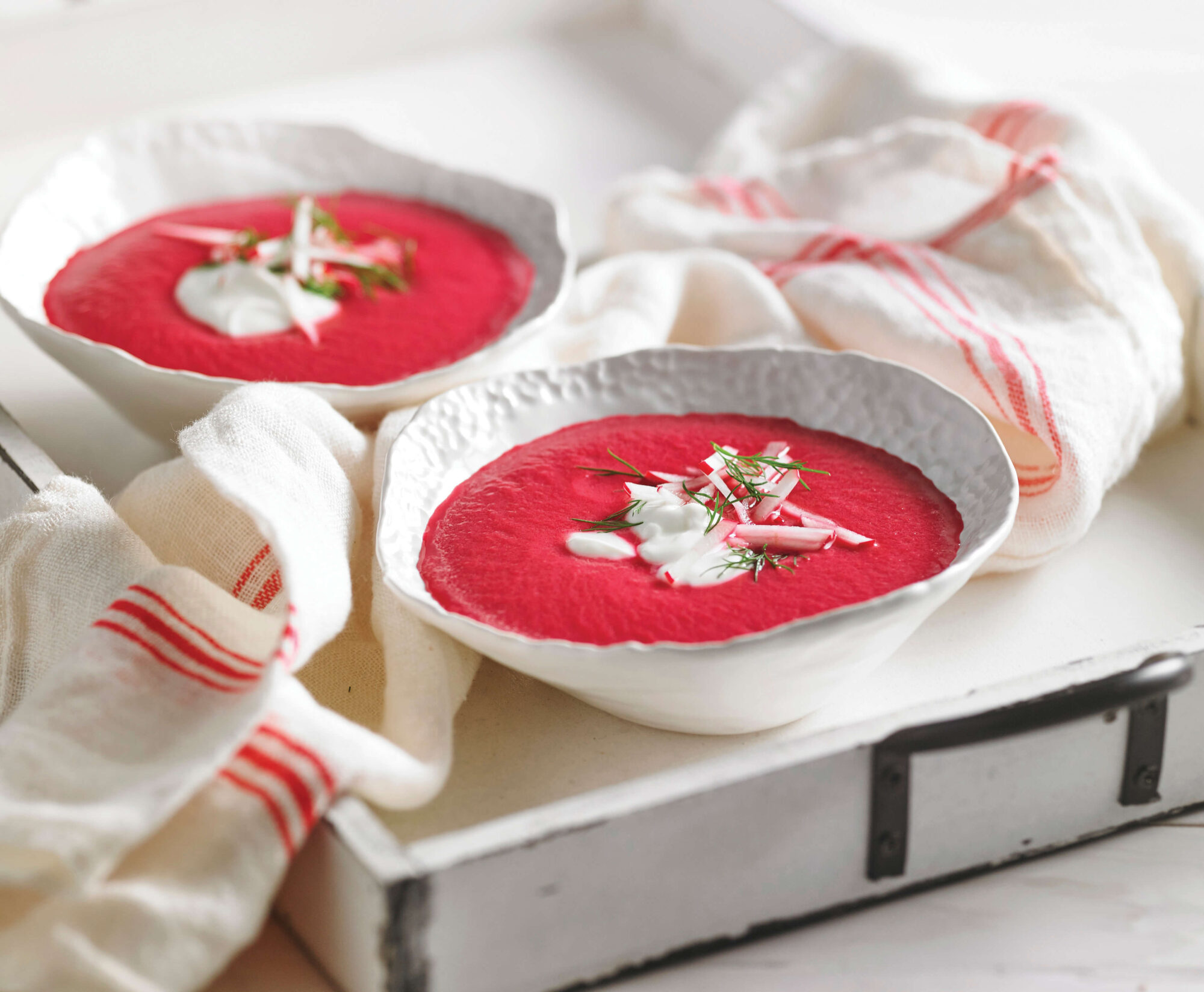 Ce potage vitaminé et coloré est aussi délicieux chaud que froid. Accompagnez-le de minipitas tartinés de fromage à la crème ou de labneh et garnis de tranches de radis saupoudrées de quelques grains de fleur de sel.