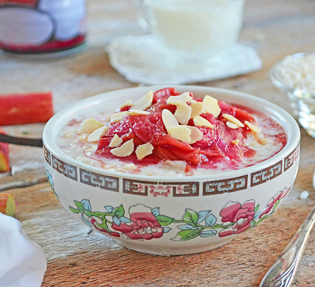 - Ajouter le riz et faire mijoter à feu moyen doux environ 45 minutes ou jusqu’à l’obtention de la texture désirée. Brasser régulièrement en cours de cuisson. Retirer la gousse de vanille et servir dans des bols individuels avec un peu de compote de rhubarbe. Garnir d’amandes effilées avant de servir.