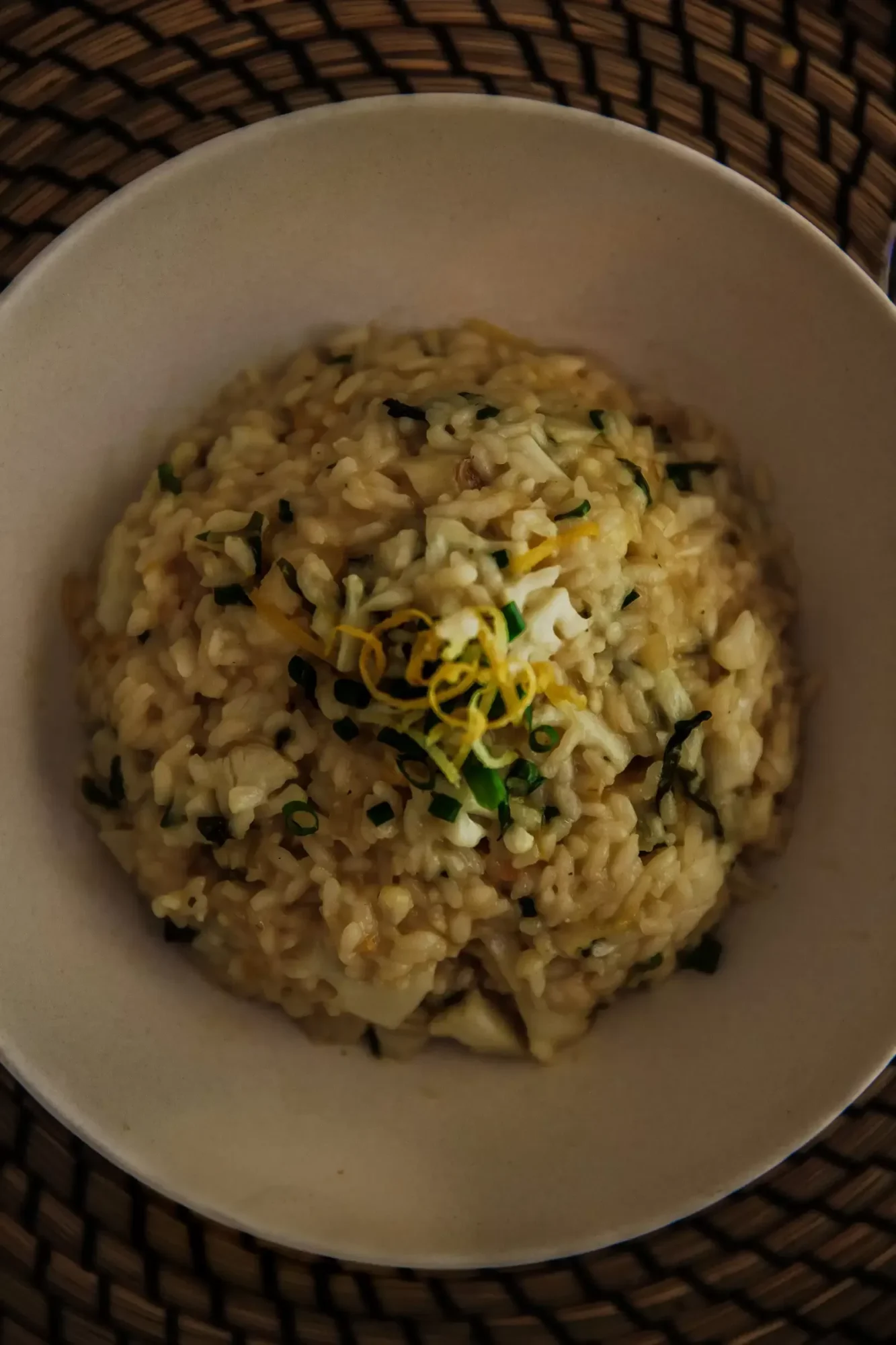 - Lorsque le bouillon est entièrement absorbé par le riz et que vous avez un mélange riche et crémeux, ajouter le parmesan, le beurre, le zeste et le jus de citron puis mélanger jusqu’à ce que le parmesan soit fondu.