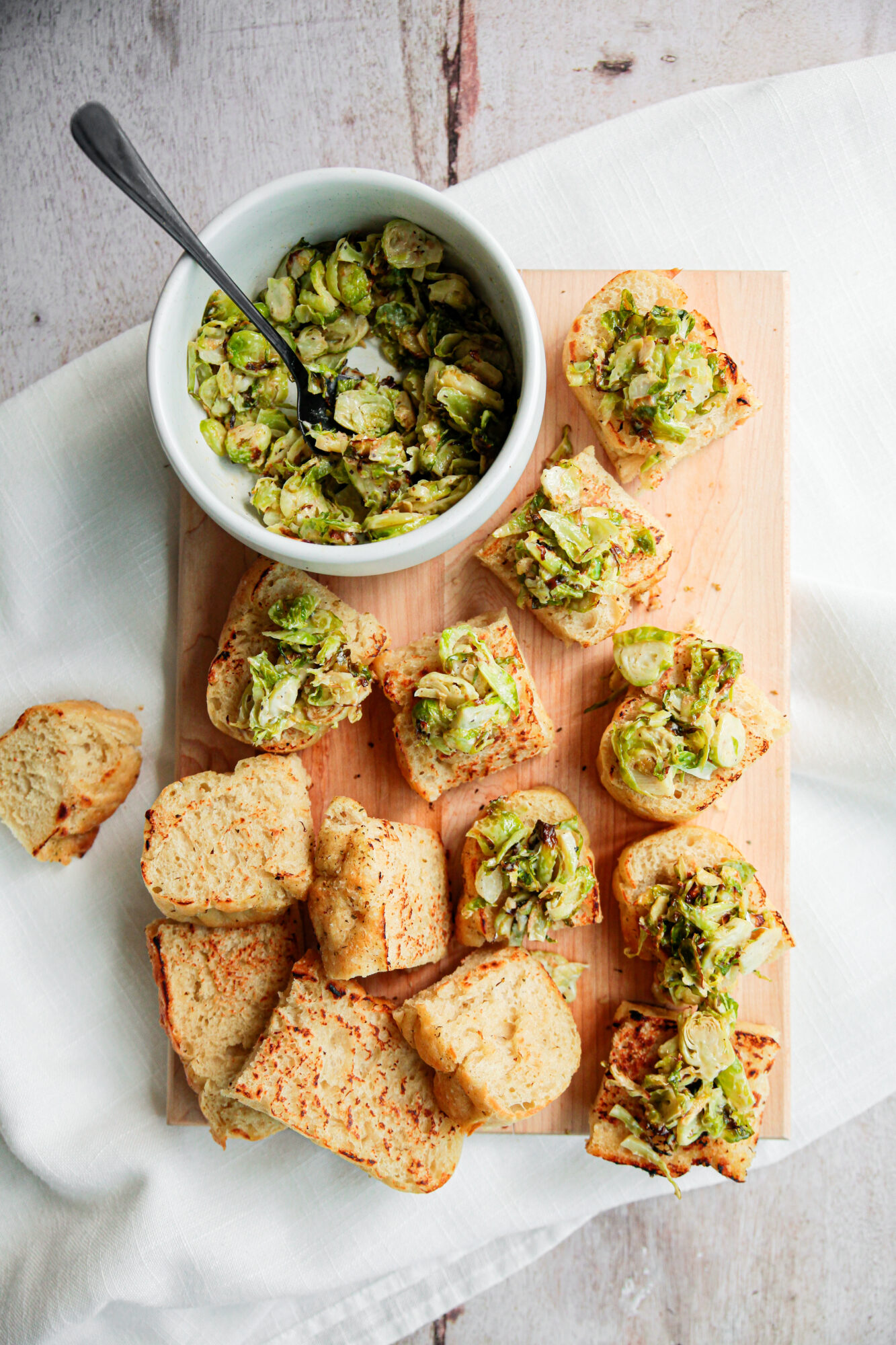 Servir sur une planche de bois avec la salade de choux de Bruxelles. Chacun pourra assembler ses bouchées !
