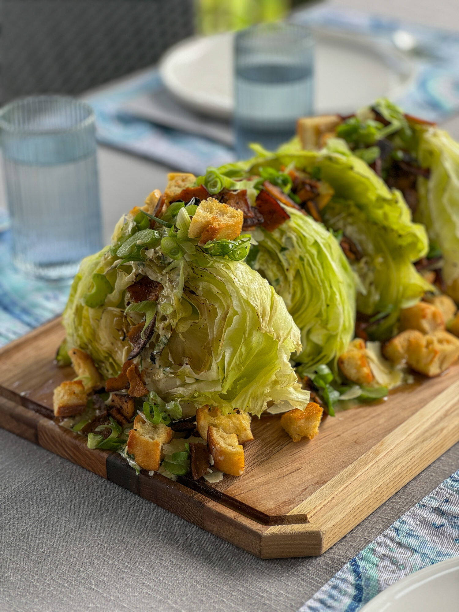 Garnir les quartiers de laitue grillés de tous les ingrédients et déguster.