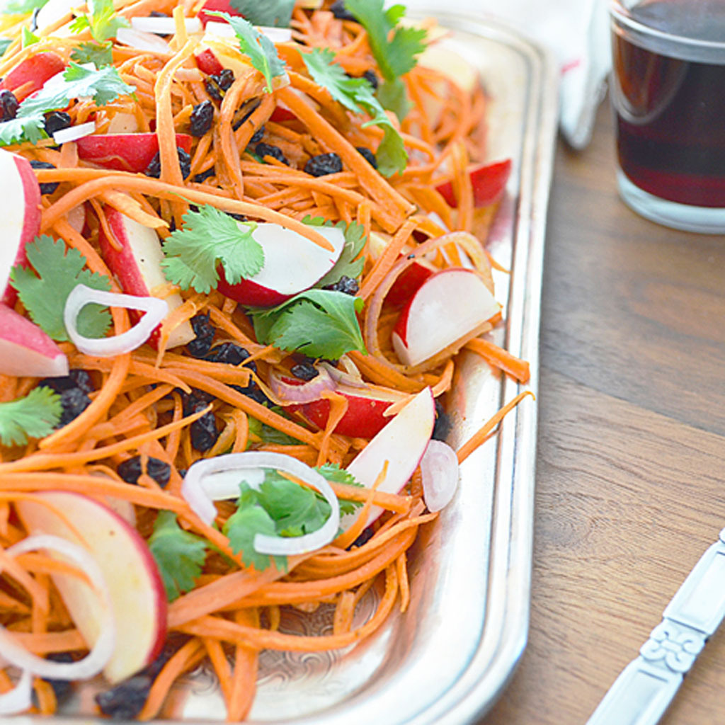 - Dans un grand saladier, ajouter les carottes, les radis, les raisins de Corinthe et l’échalote française. Verser la vinaigrette dans le saladier et bien mélanger. Ajouter la coriandre juste avant de servir.