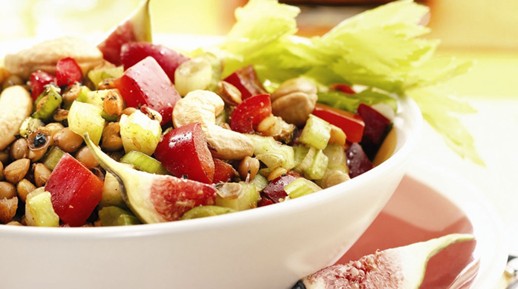 - Mélanger délicatement puis parsemer de quartiers de figues et de noix rôties. Saler et poivrer au goût. Décorer de feuilles de céleri si désiré.