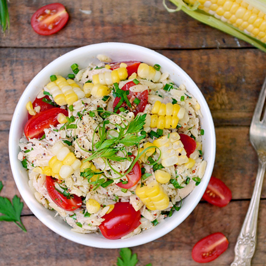 Salade d’orzo au poulet, tomates et maïs