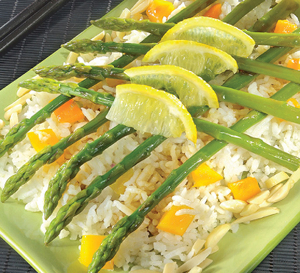 - Faire cuire le riz à la vapeur; une fois cuit, y ajouter un peu d’huile végétale et de la sauce soya au goût en séparant le riz à la fourchette. Ajouter le poivron et les amandes effilées. Transférer le tout dans un bol pour qu’il refroidisse. Dans une assiette faire un lit de riz et y déposer les asperges, arrosées de jus de citron. Assaisonner au goût. Verser la vinaigrette sur la salade et décorer de quartiers de citron.