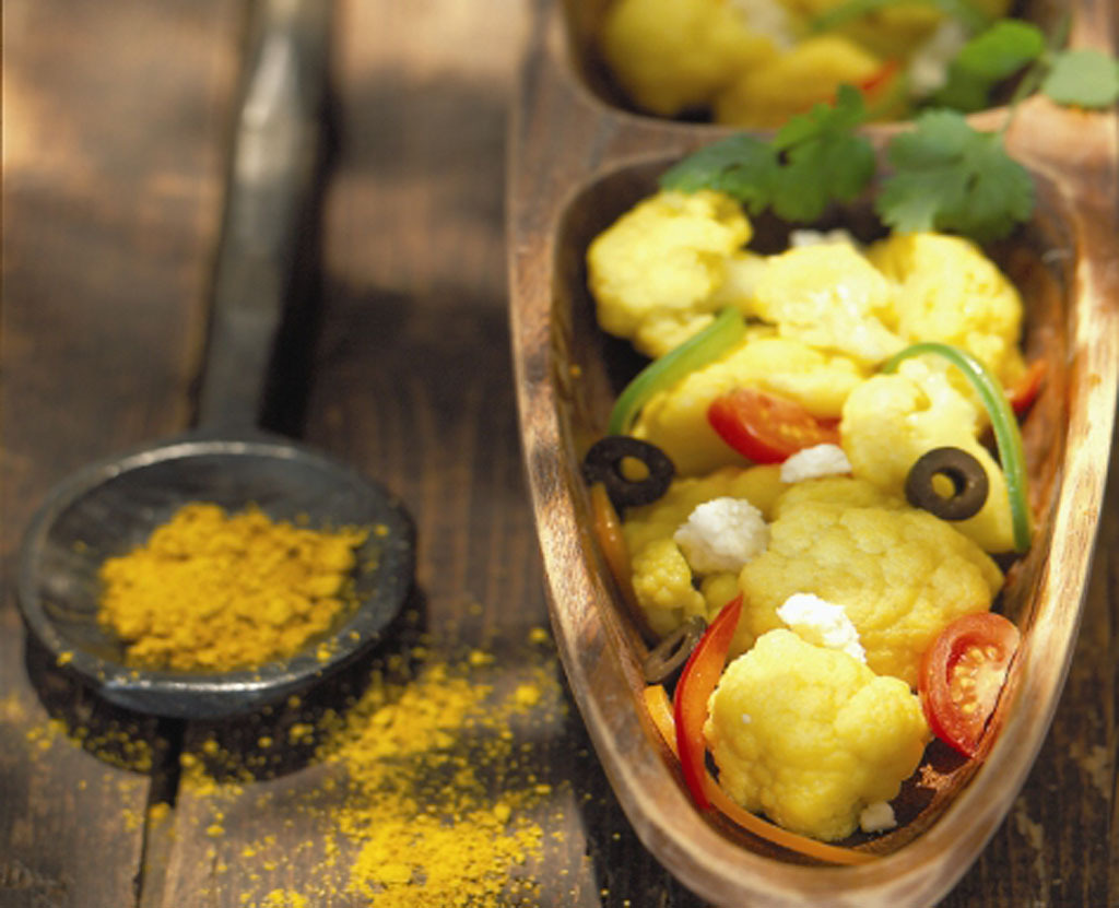 Dans une casserole, porter de l’eau salée à ébullition, puis y ajouter le curcuma. Y déposer le chou-fleur et le laisser quelques minutes seulement, juste le temps de blanchir les bouquets. Égoutter le chou-fleur. Mettre le chou-fleur dans un saladier ou dans un plat de service, puis ajouter l’oignon, les poivrons, les olives noires, les tomates, le fromage feta et l’origan. Bien mêler le tout. Verser ensuite la vinaigrette sur les légumes et bien mélanger.