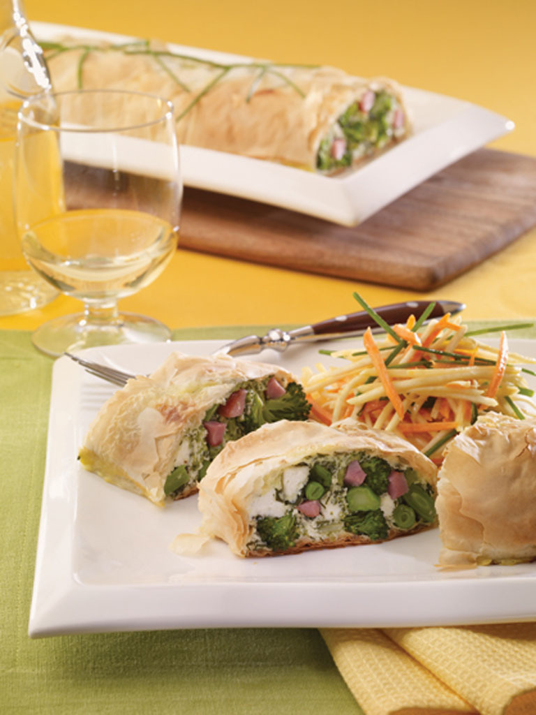 - Mélanger les légumes blanchis avec les oignons verts et les herbes; saler et poivrer. Incorporer les oeufs battus, puis les fromages et le jambon. Disposer cette garniture en une seule bande sur le côté long de la pâte de façon à former un grand cordon.