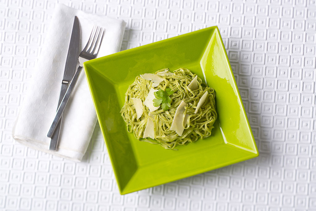 - Dans la même casserole, mélanger les pâtes avec le pesto. Ajouter de l’eau de cuisson au besoin. Rectifier l’assaisonnement.