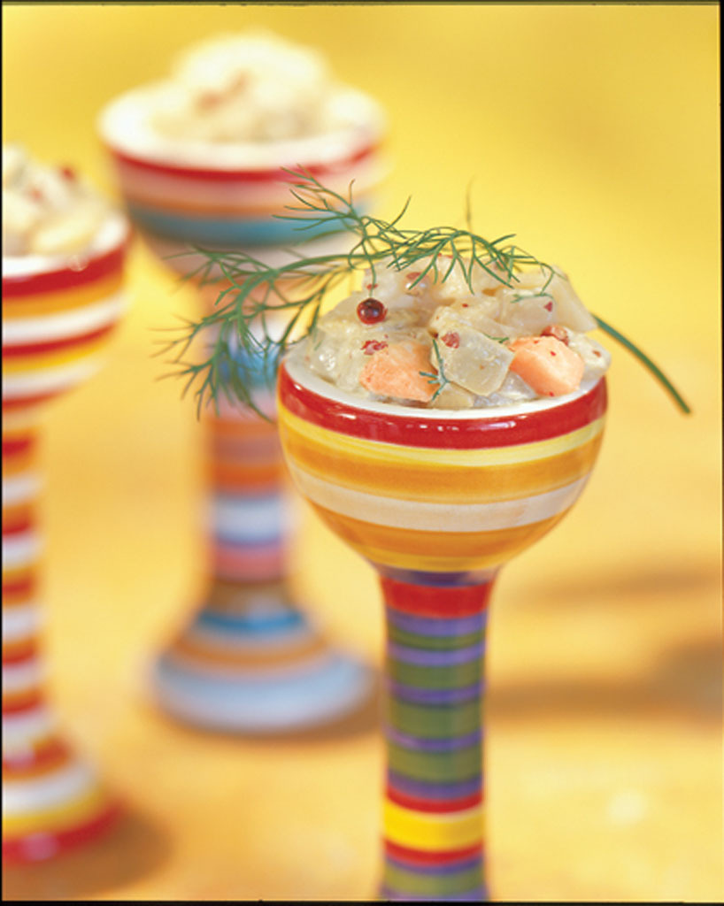 - Bien mélanger tous les ingrédients, sauf le foie gras. Ajouter ensuite le foie gras et ne mélanger que très légèrement, pour que les morceaux de foie restent entiers. Répartir la préparation dans des coupes élégantes et amusantes ou dans de jolis petits plats de service. Garnir de brindilles d’aneth et de poivre rose.