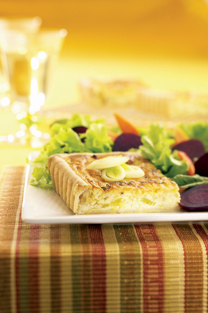 - Abaisser la pâte dans un moule à tarte rond de 23 cm (9 po) ou rectangulaire, y déposer les poireaux.