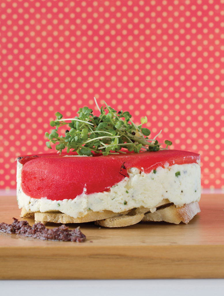 - Pour la tapenade, combinez tous les ingrédients et mélangez au robot culinaire. Démoulez les tartelettes et servez, les tomates vers le haut, avec un trait de tapenade et quelques pousses fraîches.
