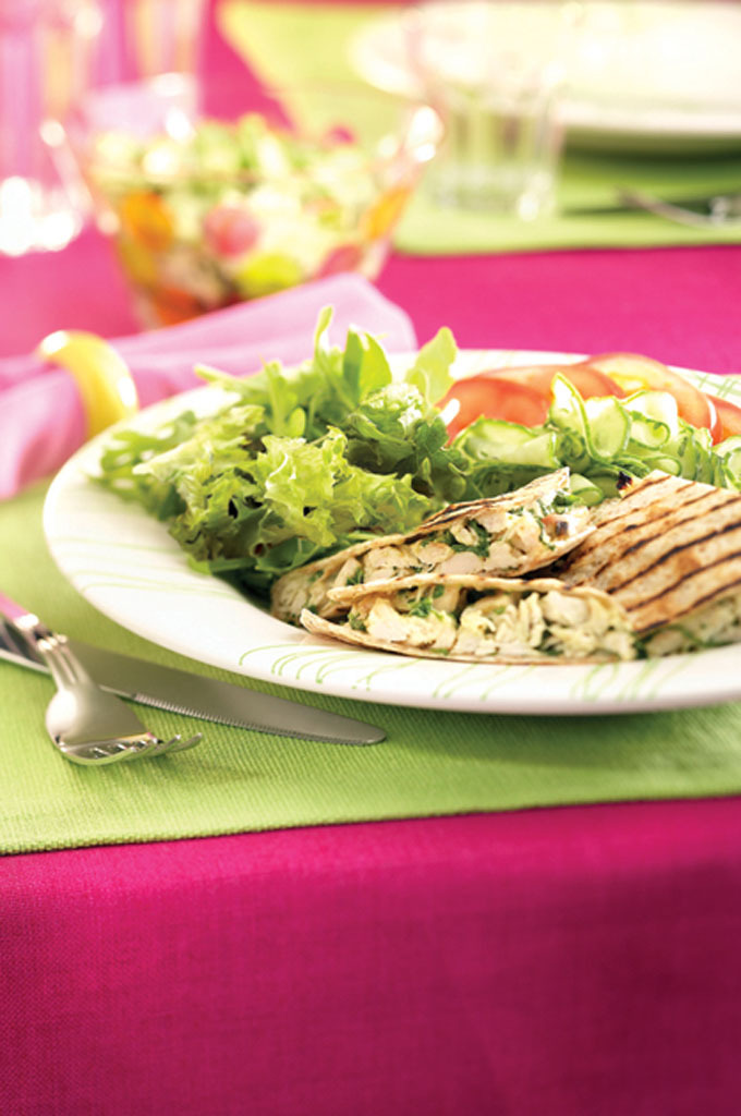 - Répartir le mélange de poulet sur la moitié de chacune des huit tortillas, puis plier en deux. Huiler les deux côtés légèrement.