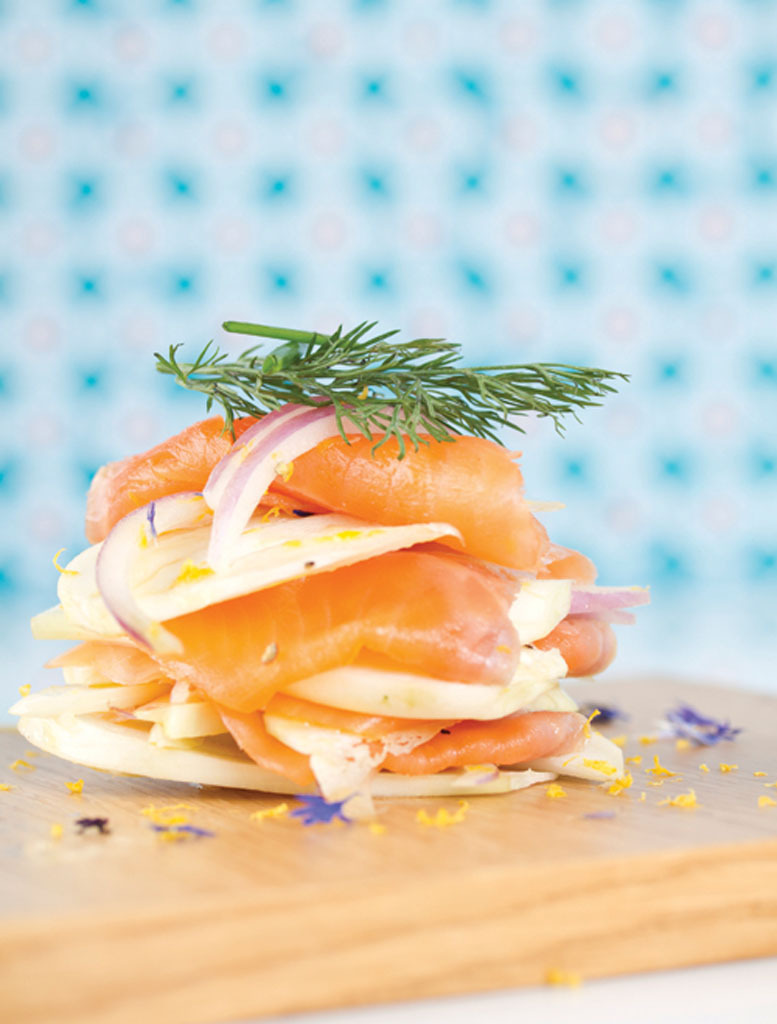 - Au moment de servir, alternez les tranches de truite et la salade de fenouil, pour une présentation tout en hauteur. Garnissez avec quelques herbes fraîches.